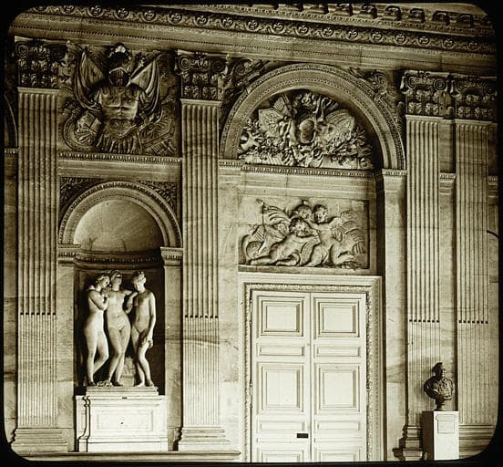 POP | Plateforme ouverte du patrimoineIntérieur, salon décoré de pilastres : trophées et groupe sculpté des Trois Grâces, vue d'ensemble