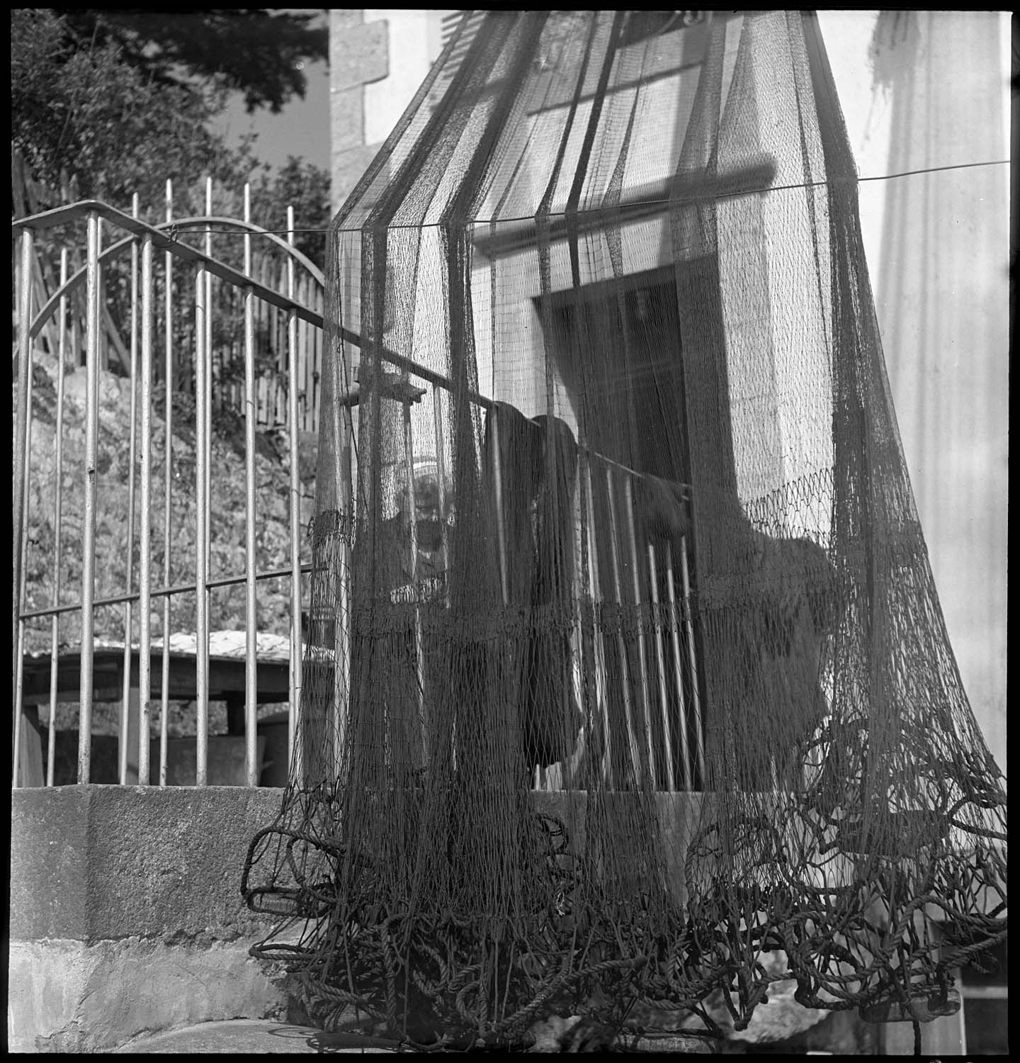POP | Plateforme ouverte du patrimoineFilet de pêche séchant sur la façade d’une maison ; Vieille femme ramendant