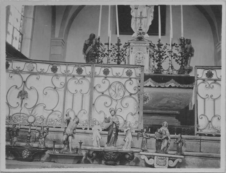 bâtons de procession : l'Education de la Vierge, saint Sébastien, monstrance entre deux anges céroféraires, saint Barthélémy, vue générale