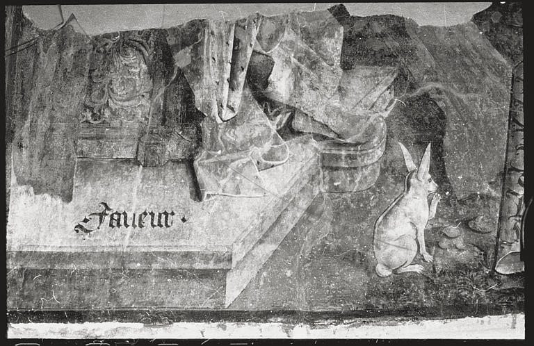 POP | Plateforme ouverte du patrimoineSecond corps de logis, partie sud, 1er étage, galerie ; peinture monumentale : fragment, lapin au pied d'un trône, inscription 'Faveur'