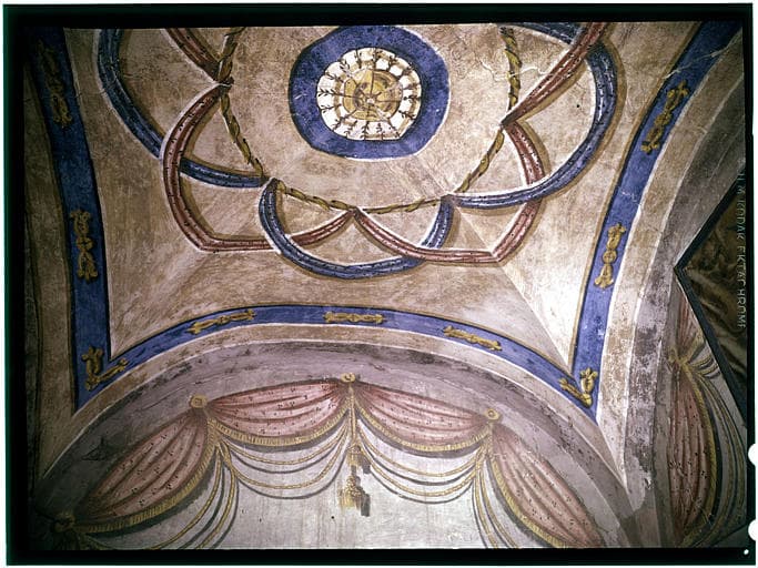 Chapelle Notre-Dame-de-Bon-Remède, voûte ; peinture monumentale : motif de rosace (centre voûte), arcs peints garnis de cantonnières en trompe l'oeil ; 1680-1685 (détail)