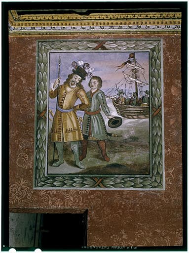 POP | Plateforme ouverte du patrimoineChapelle Notre-Dame-de-Bon-Remède, mur en retour à gauche de l'autel ; peinture monumentale : 'Scènes de l'activité de l'Ordre de la Merci', personnages, bateau, cadre en feuilles de laurier feint ;1680-1685 (détail)