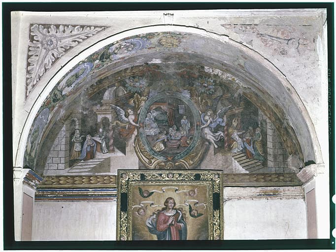 POP | Plateforme ouverte du patrimoineChapelle (?), chevet, partie supérieure ; peinture monumentale : 'Naissance de la Vierge' (médaillon central), 'La présentation au Temple', angelots (vue générale)