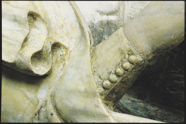 Groupe sculpté : 'Vierge à l'Enfant't, bras droit de l'Enfant, plis du drapé ; après restauration (détail)