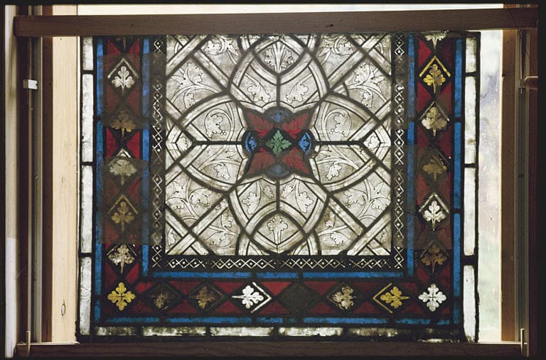 Verrière, baie n°43 : frise de feuilles de chêne, rinceaux végétaux ; avant restauration (détail)