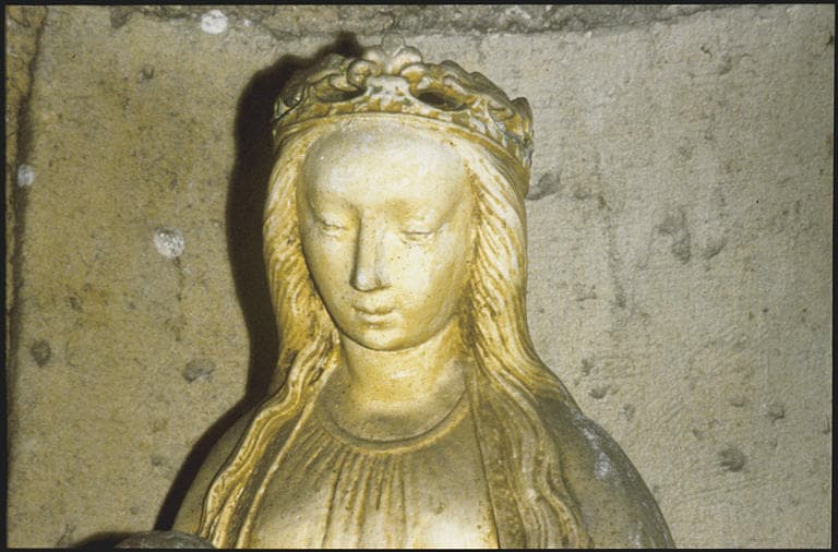 Statue : 'Vierge à l'Enfant', visage de la Vierge, couronne, pierre (détail)
