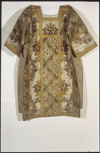 Dalmatique : soie, fils d'or, fils d'argent, brodés, motif de fleurs, épis de blé