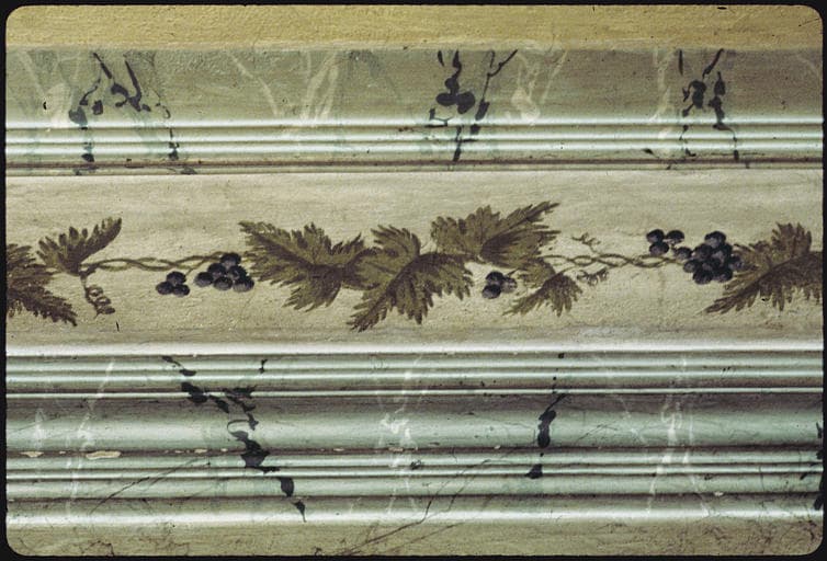Rez-de-chaussée, Grand Salon ; lambris de hauteur, corniche (trompe-l'oeil) : panneau peint, frise de baies