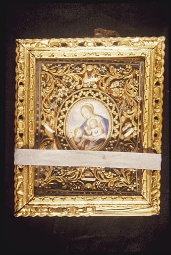 POP | Plateforme ouverte du patrimoineTableau-reliquaire : cadre en bois doré sculpté, métal, filigranes, médaillon central 'Vierge à l'Enfant avec saint Jean-Baptiste'