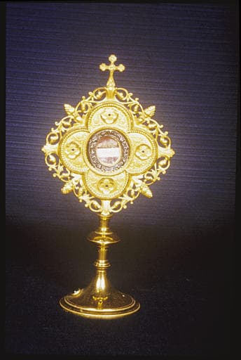 POP | Plateforme ouverte du patrimoineReliquaire-monstrance : motif central quadrilobé, rinceaux végétaux, pommes de pin, médaillon, croix