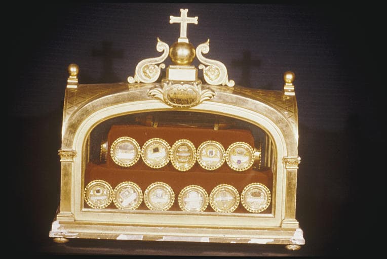 Châsse : en forme de coffret rectangulaire, ouverture sur un grand côté en forme d'arc surbaissé, croix, médaillons (12), bois doré, velours rouge