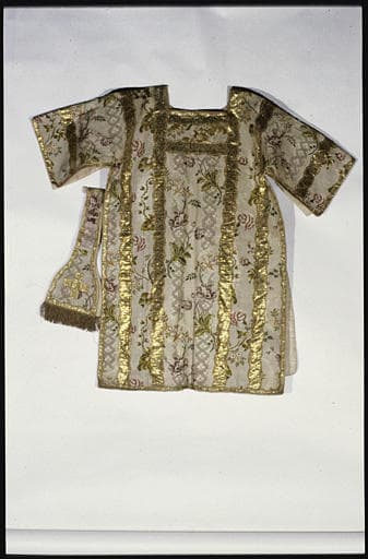 Dalmatique : tissu à fond blanc et motif de branchages fleuris, galons de fils d'or