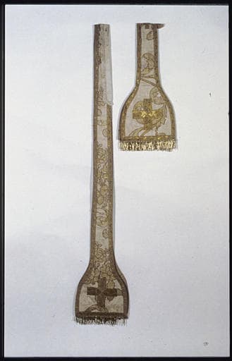 Etole, manipule : soie, galons de fils d'or, dentelle, rinceaux végétaux, croix
