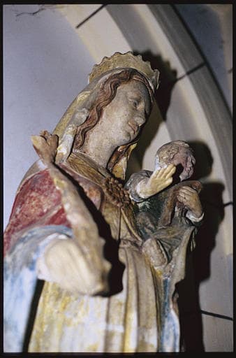 POP | Plateforme ouverte du patrimoineGroupe sculpté : 'Vierge à l'Enfant', détail visages, pierre polychrome ; après restauration (trois quart droite, détail)