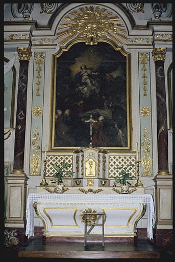 POP | Plateforme ouverte du patrimoineChoeur ; autel, tabernacle, retable, tableau : 'L'Assomption', décor en bas-relief de fleurs, de chutes de rubans, de nuées (détail)