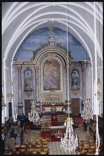 Choeur ; autel, retable, tableau, statues (2) : 'L'Annonciation', 'Saint Pierre', un saint tenant un livre fermé sous son bras droit et une épée, retable architecturé, fronton cintré surmonté par deux palmes sculptées, culs-de-lampe des niches ornés de feuilles d'acanthe et d'une pomme de pin ; 17e siècle, 18e siècle