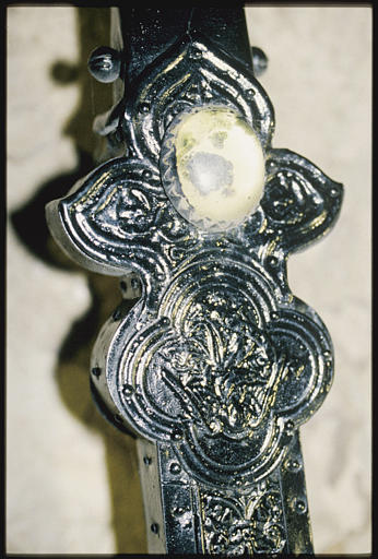 POP | Plateforme ouverte du patrimoineCroix de procession : placage d'argent sur âme de bois, détail d'une branche pattée, agrémentée d'une pierre ovale, jaune pâle, et d'un médaillon quadrilobé au centre duquel est représenté l'ange de saint Matthieu