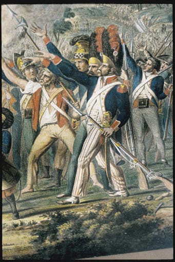 POP | Plateforme ouverte du patrimoineEstampe (?) : 'Le serment des troupes révolutionnaires', détail du groupe de soldats placés à droite de la composition, rehauts de couleur (aquatinte?)