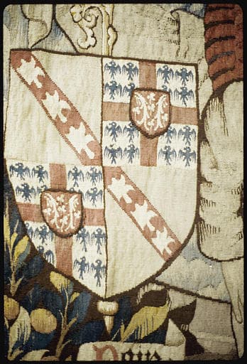 POP | Plateforme ouverte du patrimoinePièce murale (Tenture de la vie de saint Pierre) : 'La vision des animaux impurs, le baptême du centurion Corneille, l'arrestation de saint Pierre', détail des armoiries situées en bas à droite (détail)