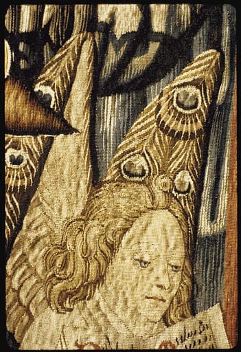Pièce murale (Tenture de la vie de saint Pierre) : 'La crucifixion de saint Pierre', visage de l'ange situé à gauche de la croix (détail)