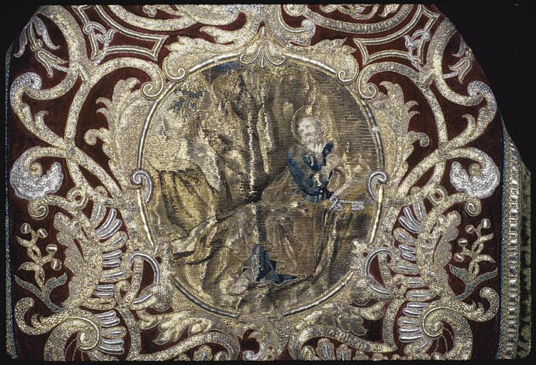Chape : velours rouge brodé de rinceaux et motifs de 'pique' en fils d'or et d'argent, détail du chaperon brodé d'une scène représentant la repentance de saint Pierre, après le reniement (détail)