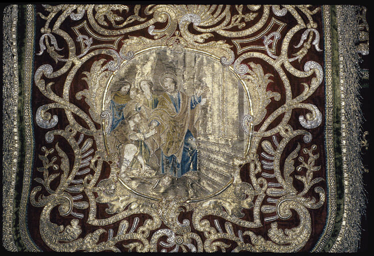 POP | Plateforme ouverte du patrimoineChape : velours rouge brodé de rinceaux et motifs de 'pique' en fils d'or et d'argent, détail du chaperon brodé d'une scène représentant la guérison d'un infirme par saint Pierre (détail)