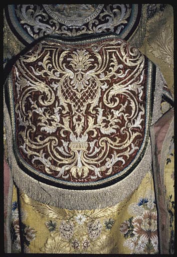 POP | Plateforme ouverte du patrimoineChape : lampas de soie jaune broché de fleurs, détail du chaperon en velours rouge brodé de rinceaux végétaux de fils d'or et d'argent (détail)