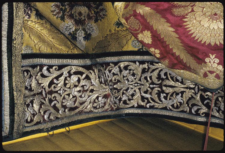Chape : lampas de soie jaune broché de fleurs, détail de l'orfroi en velours sombre brodé de rinceaux végétaux en fils d'or et d'argent (détail)