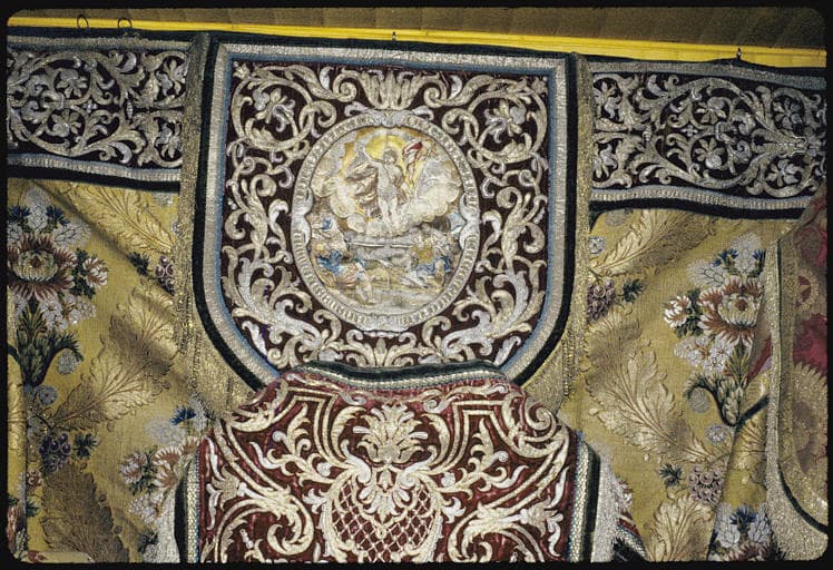 POP | Plateforme ouverte du patrimoineChape : lampas de soie jaune broché de fleurs, détail du chaperon brodé de rinceaux encadrant un médaillon avec la Résurrection du Christ (détail)