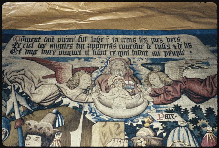 POP | Plateforme ouverte du patrimoinePièce murale (Tenture de la vie de saint Pierre) : 'La crucifixion de saint Pierre', l'âme de saint Pierre accueillie par Dieu le Père et deux anges, en haut et au centre de la composition (détail)