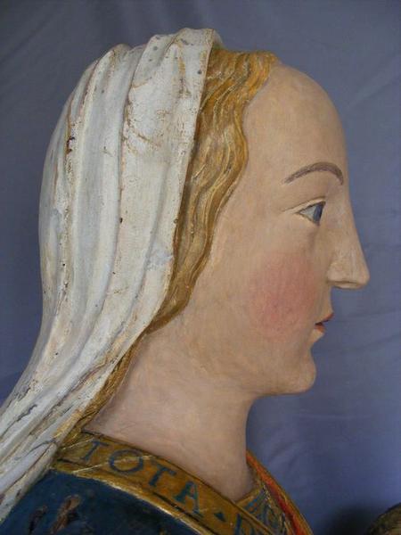 POP | Plateforme ouverte du patrimoinestatue (figure vêtue) : Vierge à l'Enfant assise, dite Notre-Dame du pilier, détail du visage de la Vierge
