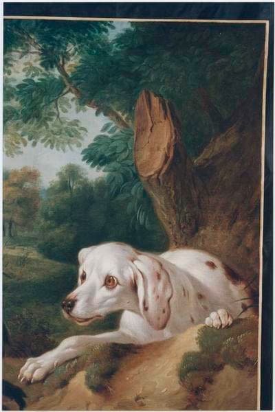 tableau : chien et faisans dont l'un en vol, détail