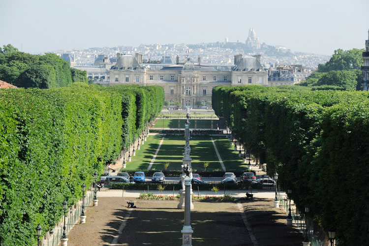 L'enfilade de l'avenue de l'Observatoire vers le Luxembourg. À l'arrière-plan, la butte Montmartre