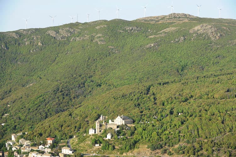 Vue d'ensemble de l'église Saint-Sylvestre au-dessus de Centuri, depuis le sud-ouest