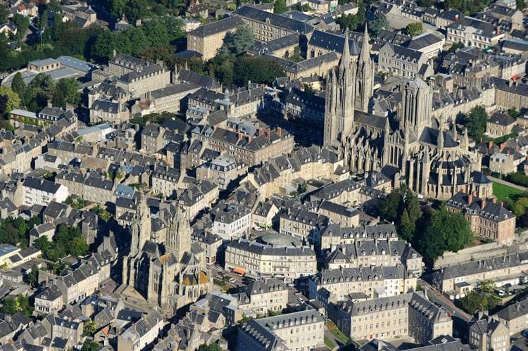 Centre-ville de Coutances depuis le sud. Église et cathédrale