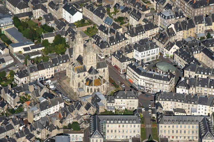 Centre-ville de Coutances depuis le sud. Église et lycée Lebrun
