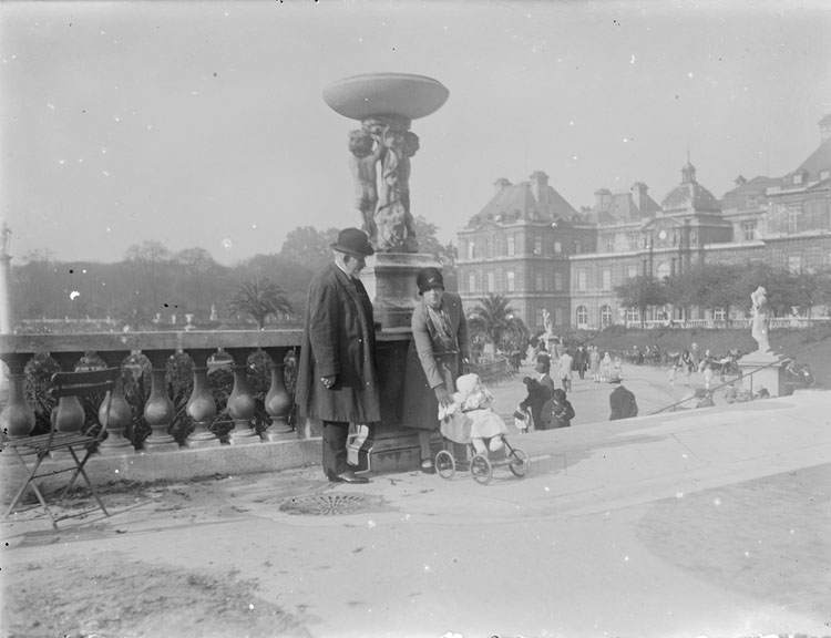 Jules Antoine regardant sa petite-fille Anne dans sa poussette, Marthe Antoine derrière la poussette, le palais en arrière-plan