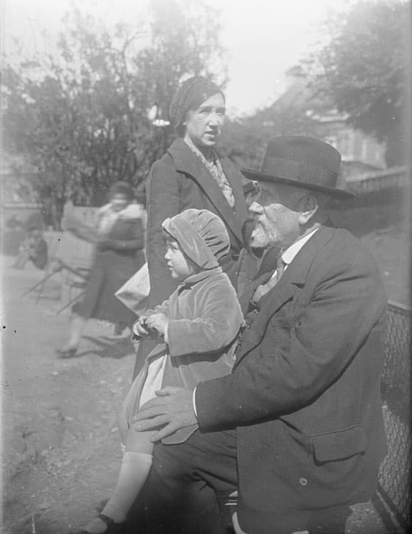 Jules Antoine sur un banc, sa petite-fille Anne sur les genoux, sous le regard de Marthe