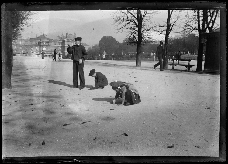 POP | Plateforme ouverte du patrimoineMarthe et Jean Antoine dessinant sur le sol, un garçon jouant avec une balle debout à leurs côtés, le palais en arrière-plan