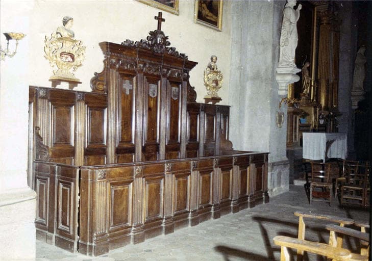 Banc d'oeuvre en bois sculpté de pilastres et d'éléments végétaux