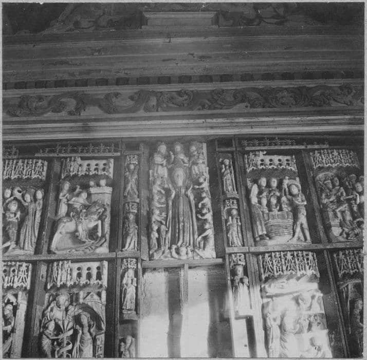 retable du maître-autel ; bas-reliefs : Scènes de la Vie de la Vierge, Scènes de la Vie de saint Georges ; statuettes : Saint Antoine et son cochon, Saint Jean l'Evangéliste, Saint André, Saint Pierre, Sainte Brigitte ?, Sainte Madeleine, Saint Jacques le Majeur, Saint Paul, Une sainte, Sainte Barbe, Saint Christophe, vue partielle