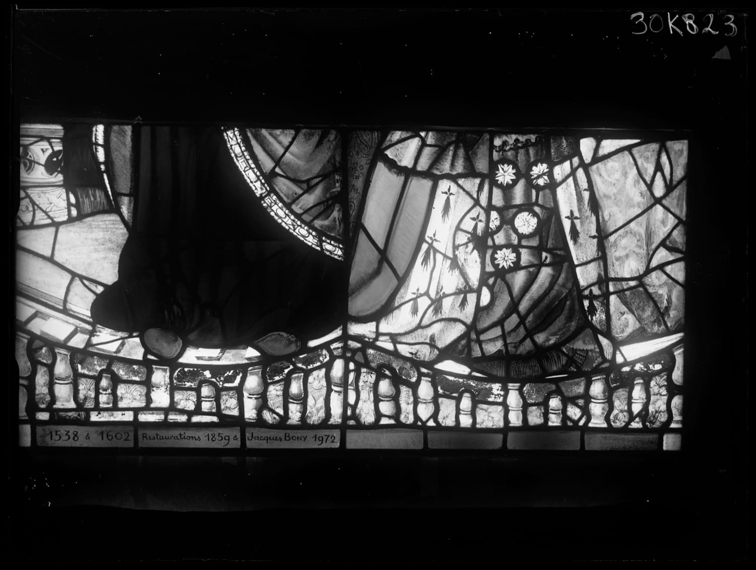 Fragments de vitraux restaurés par le peintre verrier Jacques Bony et réemployés dans l’actuelle baie 19