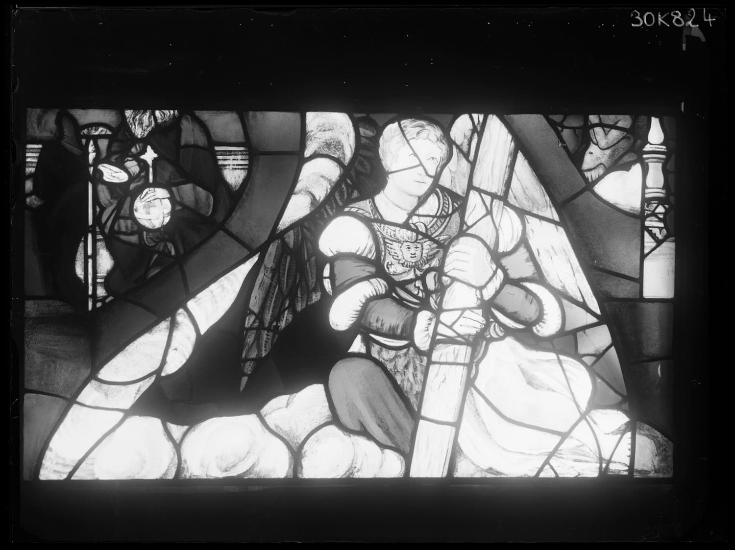Fragments de vitraux restaurés par le peintre verrier Jacques Bony et réemployés dans l’actuelle baie 19