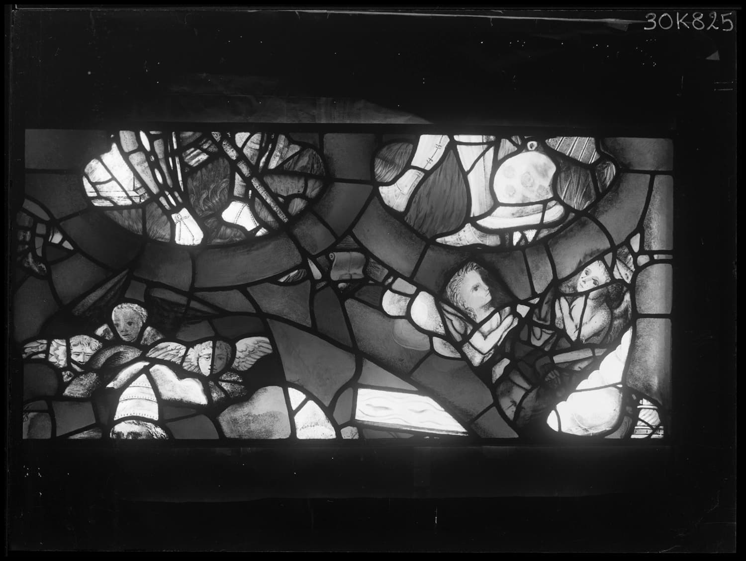 Fragments de vitraux restaurés par le peintre verrier Jacques Bony et réemployés dans l’actuelle baie 19