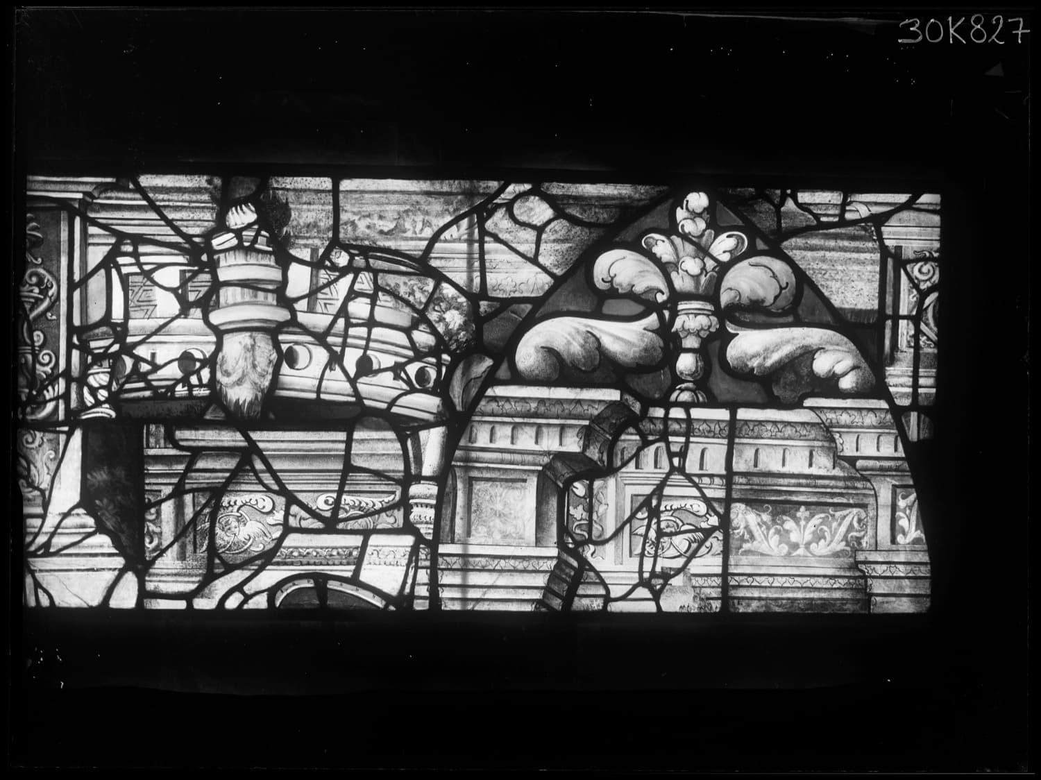 Fragments de vitraux restaurés par le peintre verrier Jacques Bony et réemployés dans l’actuelle baie 19