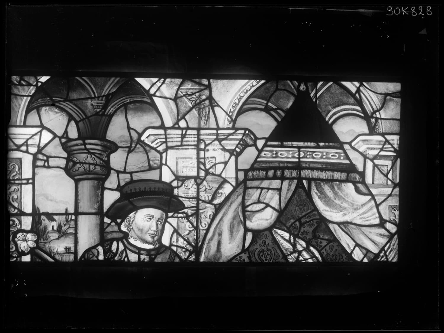 Fragments de vitraux restaurés par le peintre verrier Jacques Bony et réemployés dans l’actuelle baie 19