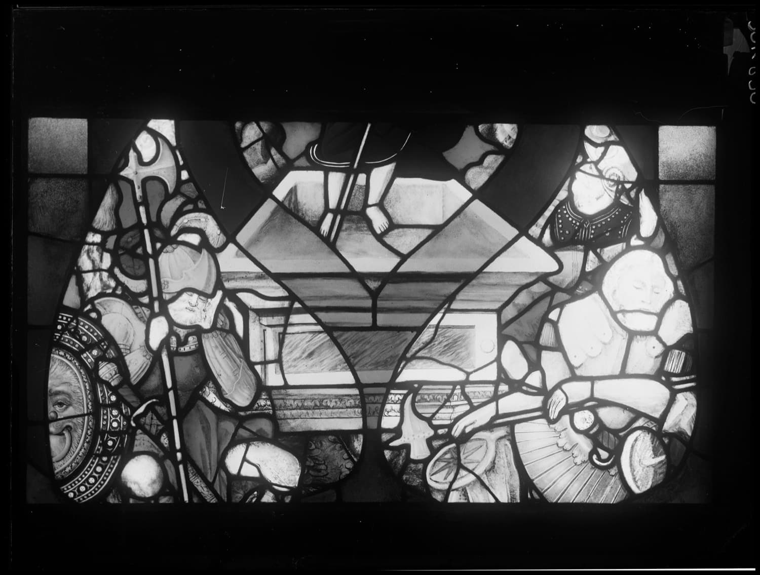 Fragments de vitraux restaurés par le peintre verrier Jacques Bony et réemployés dans l’actuelle baie 19