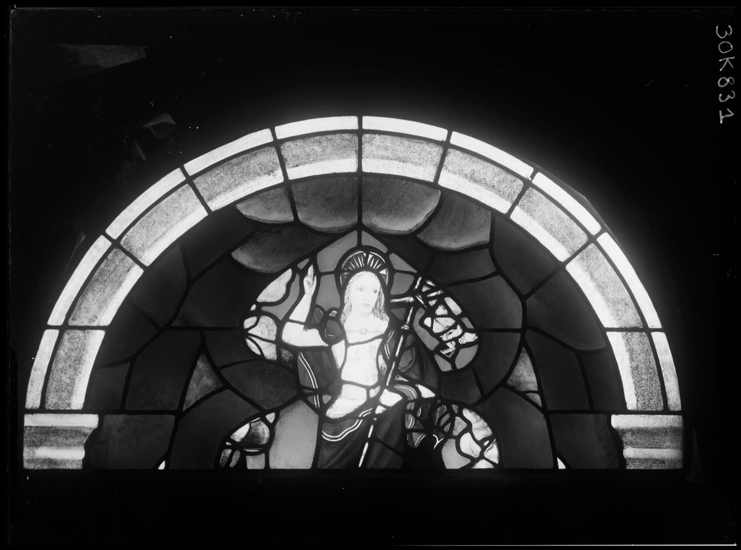 Fragments de vitraux restaurés par le peintre verrier Jacques Bony et réemployés dans l’actuelle baie 19