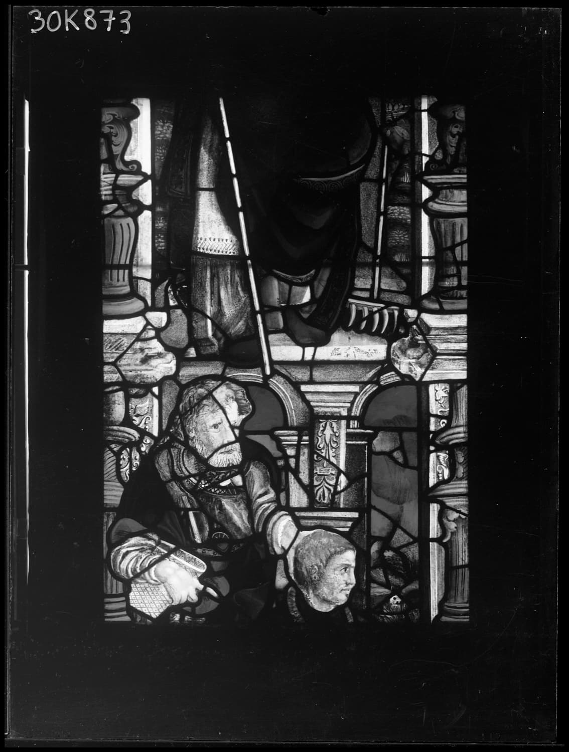 Fragments de vitraux restaurés par le peintre verrier Jacques Bony et réemployés dans l’actuelle baie 11