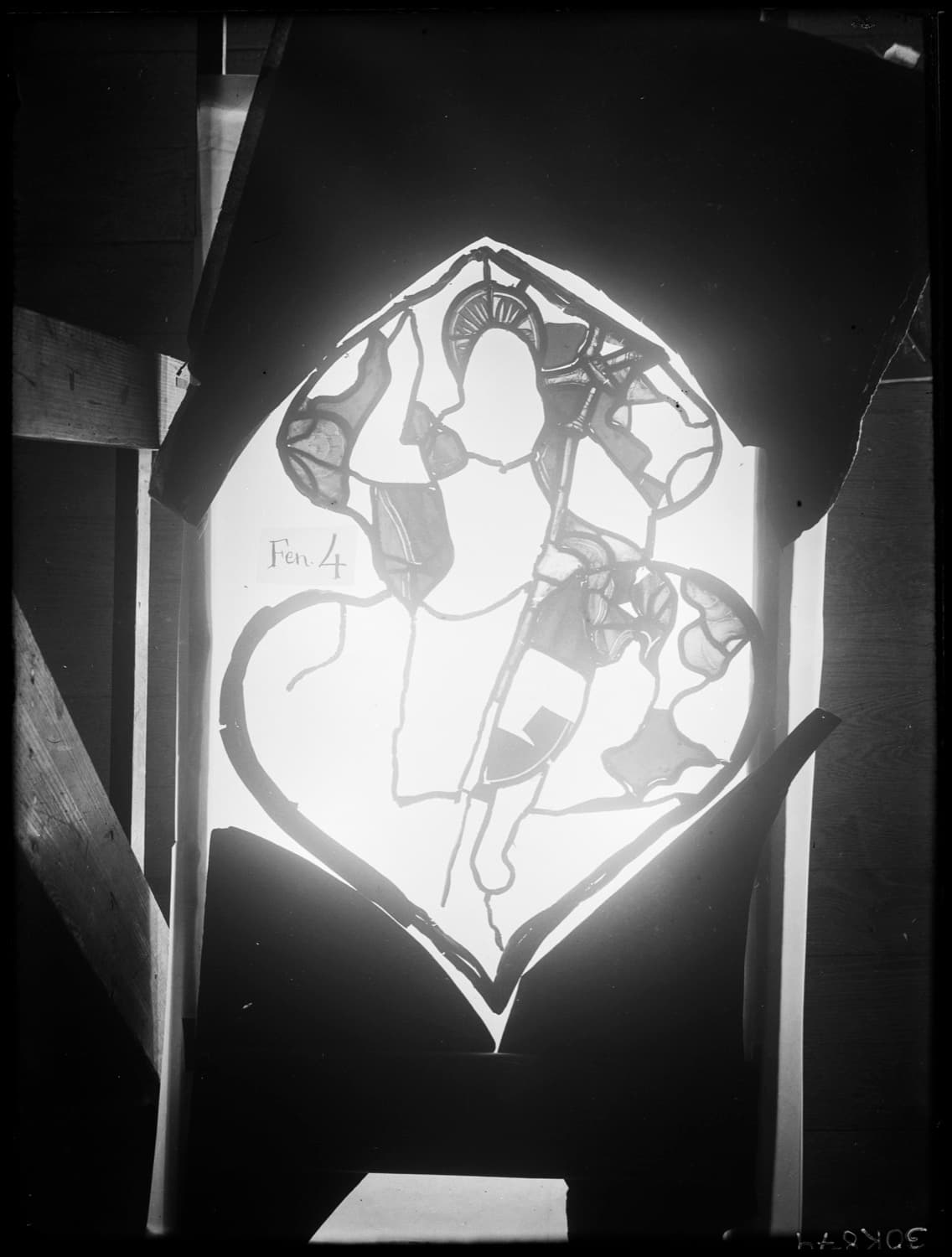 Fragments de vitraux restaurés par le peintre verrier Jacques Bony et réemployé dans l’actuelle baie 19